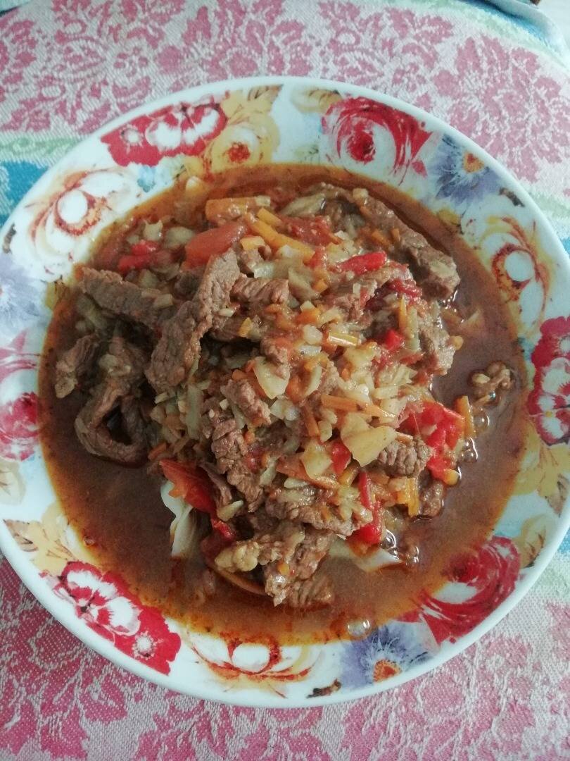 #меню Ингредиенты: мякоти говядины, морковь, сладкий перец, луковица, чеснока, красных спелых помидора, капусты, приправы "Для лагмана", соль, отваренная лагманная лапша Способ приготовления: Мясо нарежьте соломкой, морковь натрите на корейской терке, перец, капусту и лук нарежьте тонкой соломкой. Чеснок мелко порубите. Помидоры нарежьте кубиком. В кастрюлю налейте немного растительного масла, разогрейте его, после чего засыпьте лук и обжарьте до легкого зарумянивания. К луку добавьте чеснок и слегка обжарьте. Потом порциями закладывайте мясо и обжаривайте его вместе с луком и чесноком до исчезновения красного цвета. Затем добавьте капусту, помидоры и сладкий перец, посолите, всыпьте приправу и немного потушите все (минут 5-7), постоянно помешивая. После этого влейте горячей воды столько, чтобы она была выше заложенных продуктов на 3 пальца, доведите до кипения и тушите под крышкой на медленном огне до готовности мяса. За полчаса до готовности мяса положите морковь. Подавайте лагман в