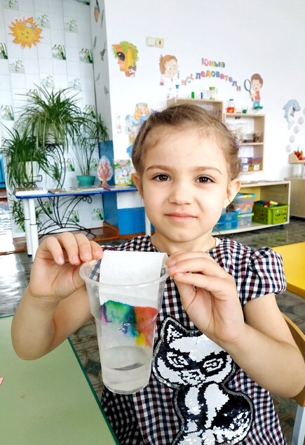 Помните поговорку - запоминалку про цвета радуги? Каждый Охотник Желает Знать, Где Сидит Фазан. Сейчас она нам пригодится! Для проведения опыта нам понадобится: набор цветных фломастеров, полоска бумажного полотенца, стакан, вода. Располагаем полоску на столе вертикально, отступаем от нижнего края примерно три сантиметра (детям можно нарисовать точку, или провести заранее линию), теперь рисуем цвета радуги горизонтально нижнему краю полоски. Сначала красным фломастером поставим жирную точку с левого края, рядом с ней на этой же линии ставим такую же точку оранжевого цвета, затем жёлтую и т. д. У нас должен получиться ровный рядок из цветных точек. Теперь наполним стакан водой примерно на три сантиметра. Возьмём нашу бумажную полоску и опустим её в воду так, чтобы между нашим цветным рядом и водой осталось немного места. Через некоторое время наши цветные точки сами собой станут превращаться в длинные полосы. Теперь у нас своя радуга в стакане! Научное объяснение Этот опыт основан на вп