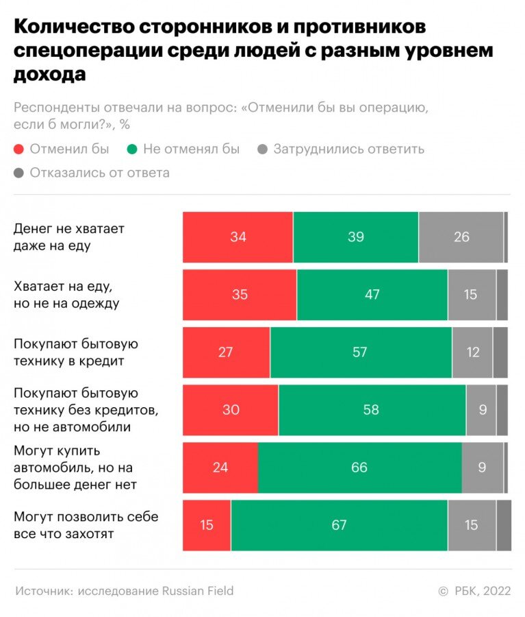 1. Очередной западный миф разрушен недавними опросами. Согласно этому мифу, политику российских властей, в том числе проведение специальной военной операции, поддерживают главным образом нищие и обездоленные россияне, зазомбированные кремлёвской пропагандой. Те самые «варвары-орки», «рабы Путина», которые якобы за всю жизнь не видали ни унитазов, ни асфальта, и теперь массово вывозят всё это из цивилизованной европейской Украины. В действительности, как видно по заглавной картинке, всё совершенно иначе. Социологи из русофобов так себе:
