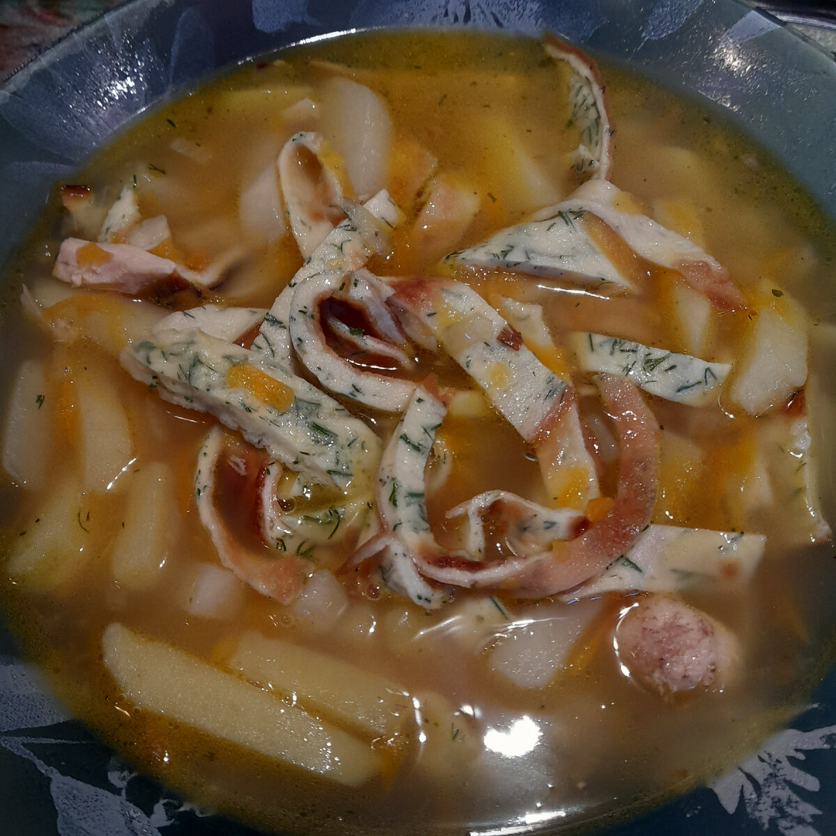 Традиционный куриный суп с омлетом вместо вермишели. Вносим новые нотки в обыденную кухню. Супы - неотъемлемая часть нашего рациона. Не просто так они являются первым блюдом в меню. Обладают богатым химическим и витаминным составом. Каждый суп привносит в наш организм калий, железо, магний, кальций фосфор, витамины и микроэлементы. Помогает подготовить желудок к употреблению второго блюда, за счет обволакивания стенок желудка полезными соединениями. Короче......полезно и все!!! Сегодня нам понадобятся: Куриный бульон с курицей – 2,5 литра; Достаточно 2 бедра курицы. Морковь – 1 шт.; Лук репчатый – 1 шт.; Картофель – 3 средних клубня; Соль, перец черный по вкусу. Омлет для супа: 3 шт. Яйцо куриное – 3 шт.; Мука – 2 ст. л.; Майонез – 1 ст. л.; Молоко – 2 ст. л.; Укроп – 20 гр.; Соль по вкусу. Начнем с омлета: Все просто. В глубокой миске все ингредиенты для омлета вымешать до однородной массы – без комочков. Жарить на растительном масле. Дать остыть. Порезать полосочками. Это у нас тип