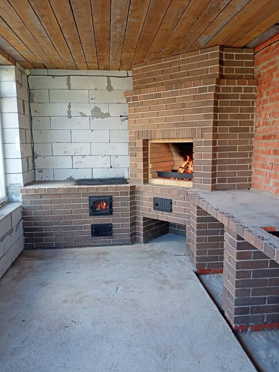 Печной комплекс. Сделали кладку печного комплекса. Комплекс состоит из стола под посудомоечную машину, 2 стола, барбекю, печь под казан . Кирпич производства Красная гвардия. Чугунное литье Везувий.