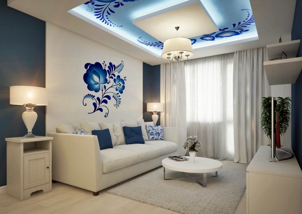 В гостиной гжельские мотивы нужно размещать акцентно, разбавлять и обрамлять, использовать цвета и материалы, создающие нейтральную заполняющую базу. Мебель с каркасом из натурального дерева. Бежевый, соломенный, нежно-желтый, светло-коричневый, бронзовый, темно-коричневый, серо-зеленый оттенки. Если в гостиной вы решили установить полноценный камин или имитацию, оформление его изразцами задает тон всей обстановке. По сути, такого яркого центрального элемента достаточно для полноценной стилизации.
