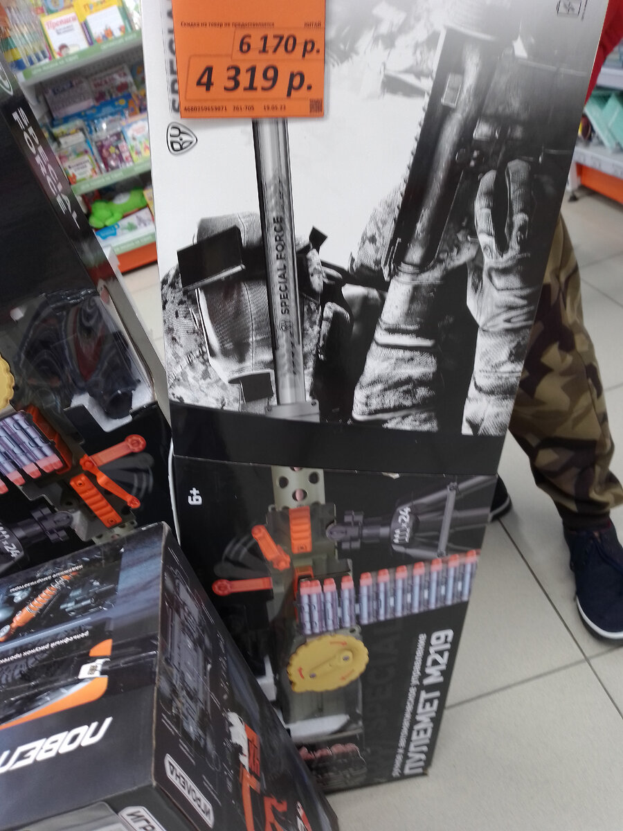 Ну, вот и дети теперь наши начинают вооружаться! Зашли сегодня в наш любимый "Галамарт" и удивились такой военной игрушке для мальчишек. Смотрите сами: Пулемёт детский марки м219 по цене 4319р. за штуку. Кстати, размерами тоже немаленький. Вот таких два пулемётика там в детском отделе возле игрушек стоят. Кстати, обратите внимание на надпись на коробке- special force! Ведь она фактически обозначает-"спецназ", "подразделения специального назначения" и всё, что связано с военными операциями. Нет, ну понятно, что мальчики должны вырастать военными, умеющими защитить свою Родину от врагов. Поэтому у каждого мальчика в детстве был игрушечный пистолетик или автоматик, но что бы пулемёт, да ещё вот такой громадный??? Кстати, а ведь кто-то непременно купит своему сыночку или внуку такой крутой пулемёт! И в кого потом станет стрелять этот ребёнок??? А вы бы хотели в "Галамарте" купить своему ребёнку такую военную игрушку? Не рановато ли?! Может, всё же присмотреться к другим развивающим иг