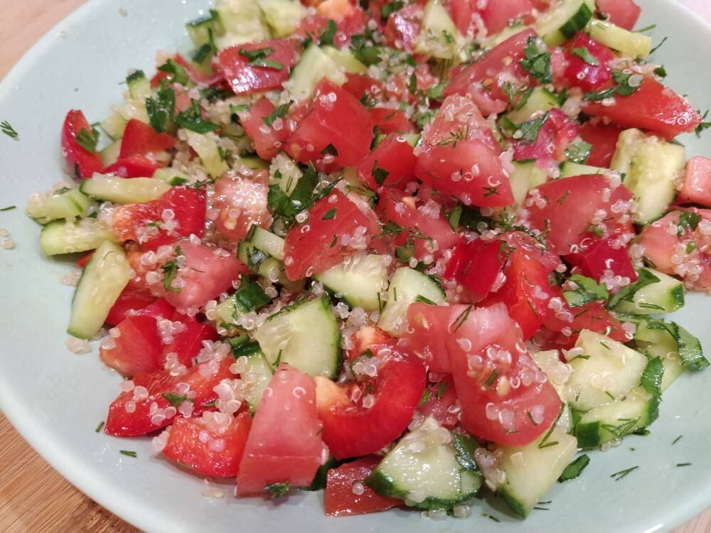 #пп #меню Яркий, весенний летний салатик. Киноа придает текстуру салату и делает более питательным и сытным. Ингредиенты: отваренного киноа, свежий огурец, томат, сладкого перца, зелень укропа и петрушки, красного винного уксуса, подсолнечного нерафинированного масла, льняного масла, соль Способ приготовления: Подготовим продукты. Овощи помыть и почистить. Киноа отварить как написано на упаковке. Зелень мелко нарезать. Томат, огурец и перец порезать на одинаковые кубики. Добавить киноа. Посолить, полить маслом и перемешать. Дать настояться 5 минут. #Приятногоаппетита!
