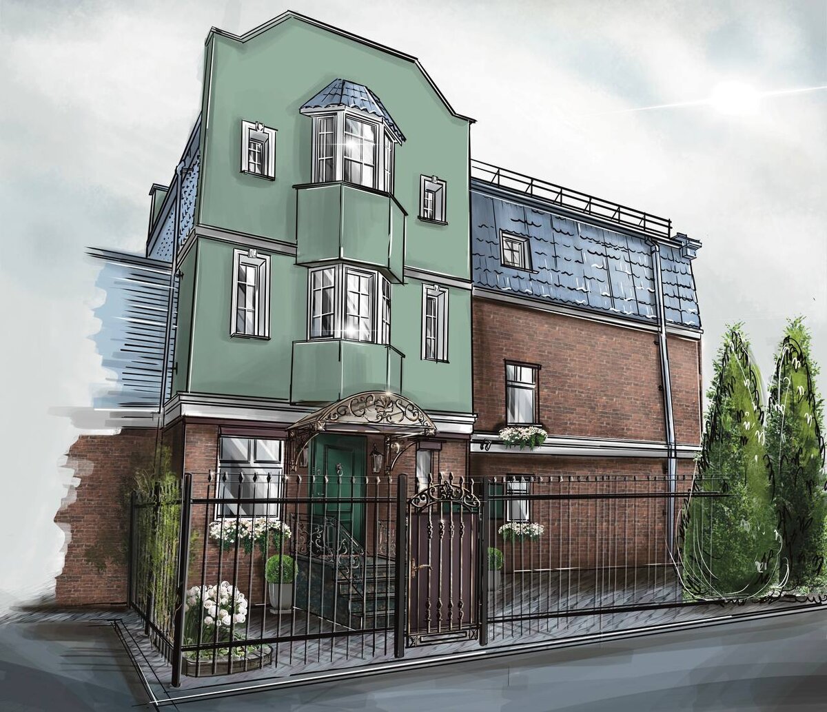 Расскажем на примере эскизного проекта реконструкции фасада, в котором использованы следующие приемы: · Мягкий контраст всех составных частей сооружения · Оштукатуренные поверхности имеют сложный приглушенный оттенок · Отделка фасада под кирпич выполнена из облицовочной плитки под старинный кирпич реставрационного класса, воссоздающий эпоху 18 века. Это придает облику дома историческую романтику, благородность и солидность · Цокольный пояс никак не выделен, что свойственно английским особнякам · Спокойная теплая белизна оконных обрамлений и межэтажных карнизов (без излишней белоснежности) · Темно-коричневая отделка крыльца из гранита выделяет его на фоне кирпичной стены, придает ему солидности и делает центром притяжения главного фасада · Изюминкой входной группы является дверь в классическом исполнении (эффектный вариант в темно-зеленом оттенке) · Кованные перила и декор козырька – несомненное украшение фасада – находится в перекличке с новым цветом забора и калитки · Настенные свети