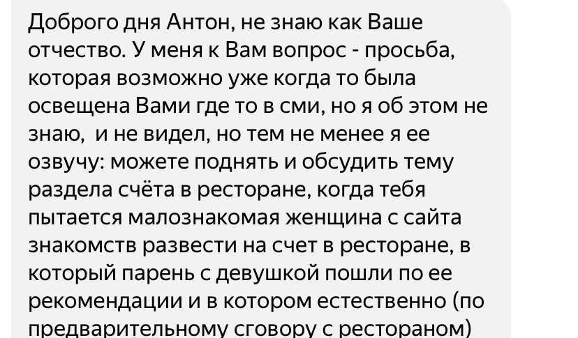 Признаться, о таких ситуациях я слышал наверное пару раз за десять лет и не могу представить, как это работает. В чем обман? Ведь когда вы соглашаетесь сводить женщину на ужин (эта статья о разводе женщинами мужчин, а не наоборот), предполагается, что вы будете за все платить. А когда заходите в ресторан, понимаете по интерьеру, обстановке, названию и его местоположению, сколько здесь стоит среднее блюдо. Наконец, на входе есть меню, с которым желательно ознакомиться до заказа. Но тем не менее, запрос притупил - подписчик попросил осветить эту тему. Предлагаю разобрать пару вариантов. Чисто гипотетически. Вариант 1 - чек пополам Допустим, мужчина и женщина договорились, что на первом свидании каждый платит сам за себя. Но когда вы поужинали, и девушка при этом поела на чек выше среднего, она отказывается платить. Вариант 2 - вышла за пределы договоренности В случае, когда мужчина согласился заплатить за женщину, но сразу обозначил определённый лимит, который он может «осилить». Но дев
