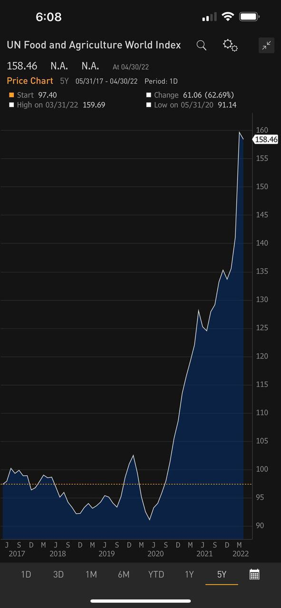 На графике индекс мирового продовольствия. Высокие цены на зерновые культуры сохранятся еще 2-3 года и на данный момент они выросли уже на 70-90% за год. Подорожала еще и доставка зерна, потому что экспорта из Украины и России уже нет (многие страны тоже ограничили экспорт) и логистика сильно поменялась. Украина вряд ли в следующем году сможет засеять даже половину от прошлогоднего урожая и страна рискует потерять сразу три урожая: прошлогодний (не могут вывезти, так как порт заблокирован, а по оставшимся веткам ЖД и автомобильного транспорта всего 1.1 млн. тонн в месяц из необходимых 22-29), нынешний (засеяли только 60% урожая, а часть пострадает из-за пожаров от военных действий и слишком дорогого топлива) и будущий (окупится только при высоких ценах на зерно). Все виды удобрений, техника для с/х и топливо сильно подорожали, а дефицит на рынке удобрений связан в том числе с тем, что Россия ограничила его экспорт. Само производство удобрений сильно зависит от стоимости энергоресурс