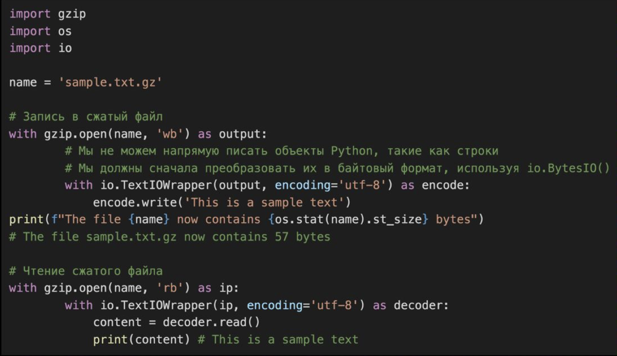 gzip — это формат файлов и программное приложение, используемое для сжатия и распаковки файлов. Модуль gzip предоставляет простой способ работы с файлами gzip (.gz). В данном примере демонстрируется, как записать данные в сжатый файл и прочесть их. #практика #python