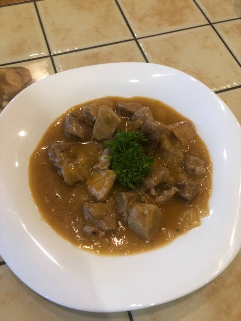 Классическое мясное блюдо на повседневный ужин 👍🏼 Ингредиенты: свинины, луковицы, томатной пасты, муки, кипятка, сахара, сливочного масло, лавровых листа, Соль, перец, Растительное масло Способ приготовления: Мясо нарезать на небольшие кубики. Обжарить партиями на сковороде (я готовила в чугунном казане) до золотистой корочки. Убрать в сторону. Лук нарезать кубиками, обжарить в этой же сковородке до слегка золотистости, добавить сахар, посолить, поперчить. Муку обжарить на сухой сковороде до красивого коричневого цвета, добавить растопленное сливочное масло, кипяток, томатную пасту, тщательно перемешать, чтоб не было комочков. Посолить, поперчить по вкусу. Варить на среднем огне, помешивая 5-7 минут. В глубокой сковороде смешать мясо, лук, залить подливкой, добавить лавровой лист. (Подлива в этот раз получилась у меня густая и я добавила ещё полстакана кипятка). Тушить на слабом огне 40 минут. Периодически помешивать, чтоб не пригорело. Приятного аппетита! 🌸