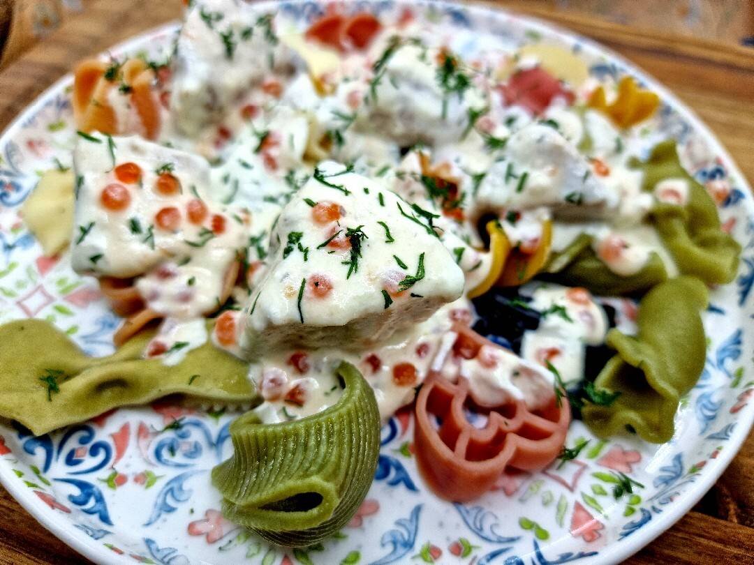 Лучше для этого рецепта, конечно, использовать лосось, но чем богаты, тем и рады: с тунцом получается тоже отменно! Ингредиенты: лосося или тунца, пасты, сливок 20%, приправы Kotanyi, лососевой икры, пасты с трюфелем, муки, оливкового масла, Соль Способ приготовления: Пасту отварить в чуть подсоленной воде. Рыбу нарезать на куски и слегка обжарить на масле. Залить рыбу сливками, добавить приправу и трюфельную пасту, нагреть и вмешать муку, прогревать до загустения. Добавить в соус икру, перемешать и вместе с рыбой выложить на готовую пасту.