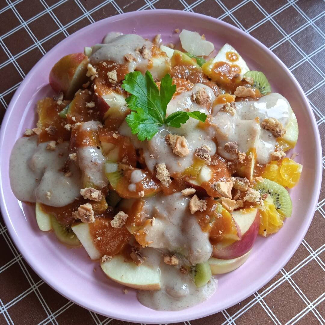 Очень вкусный салатик. Фрукты сами по себе вкусные и полезные, но банановый соус и солёная карамель придают им особый вкус. #непп Ингредиенты: яблоко, киви, апельсин, груша (фрукты можно брать любые, даже консервированные), для крема: , 1 банан, сгущённого молока, для карамели: , сахара, , сливок 33 %, , соль, шоколадное печенье для украшения Способ приготовления: Из яблок удалить сердцевину, нарезать дольками. Киви почистить нарезать крупными кусочками или дольками. Апельсин почистить нарезать полукольцами или четвертинками. Грушу почистить, удалить сердцевину, нарезать дольками, всё сложить в миску. Для крема: банан почистить, нарезать кружочками, положить в чашу миксера, добавить сгущёнку, перебить. Для карамели: в сотейник всыпать сахар, растопить до тёмно- коричневого цвета, влить сливки, перемешать венчиком до однородности. Добавить пару щепоток соли, перемешать снять с огня. Фрукты перемешать, выложить на них банановый крем, полить карамельным соусом, посыпать крошкой из шоколад