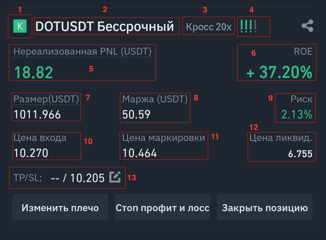 Проще говоря, если тянуть большую прибыль с большим кредитным плечом, то вероятность, что бинанс закроет вашу позицию сам - возрастает. И просто если вы видите все заполненные восклицательные знаки, то будьте готовы, что в любой момент вас может закрыть. - Нереализованный PNL. Это ваша потенциальная прибыль, которую приносит позиция в этот момент времени. Если закрыть позицию, то вы зафиксируете указанную прибыль.
