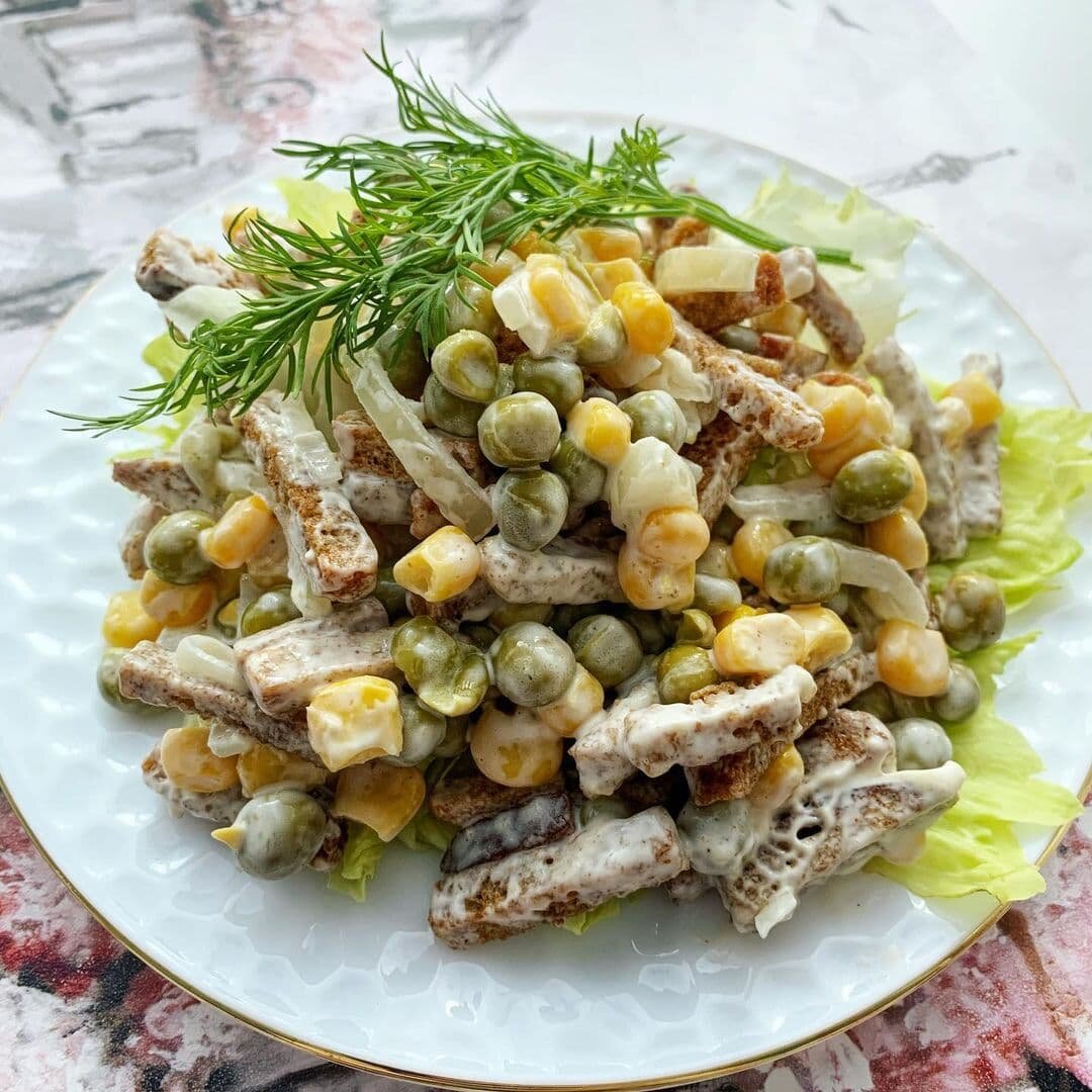 💥БЫСТРЫЙ И ПРОСТОЙ САЛАТИК🌿 Самое сложное в этом рецепте - замариновать лук! 😄🧅 Сложность ⭐️ ⏰15-20 мин. ⠀ #veg_обед #veg_ужин ✅ Ингредиенты: ▪️ банка горошка ▪️ банка кукурузы ▪️ крупная луковица ▪️ сухарики ▪️ постный майонез ▪️ 1/2 ч.л. соли ▪️ 1/2 - 1 ч.л. сахара ▪️ 1 ч.л. яблочного уксуса ▪️ немного растительного масла 👩🏻🍳 Как готовить: ▶️ Замариновать лук: нарезать полукольцами, сложить в пиалу, залить кипятком, добавить сахар, соль, уксус, растительное масло. Накрыть крышкой и оставить до полного остывания. ▶️ Из горошка и кукурузы слить сок. Также слить лук, чтобы ингредиенты были по максимуму «сухие». Смешать. ▶️ Перед подачей добавить сухарики (можно сделать самим), постный майонез, можно немного зелени. Приятного аппетита! 🍴