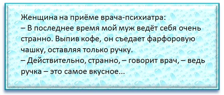 Смех полезен для здоровья, он позволяет расслабиться всему организму и даже сжечь лишние калории, наетые, например, плиткой шоколада. Всего 15-20 минут смеха в день – и вы не только избавляетесь от стресса, но и продлеваете себе жизнь. Правда, итальянские учёные утверждают, что смеяться полезно не менее 30 минут в день. Но ведь вы не будете смеяться строго по часам! Важно вообще позволять себе порцию юмора в день. Например, читать анекдоты: или рассматривать карикатуры: или пролистывать смешные цитаты из фильмов: Смотреть всю цитату на странице сайта Структура нашей жизни. Анита Мурджани, чудесным образом исцелившись от рака, утверждала, что «Смех и радость – это и есть путь к счастью!»: «Если бы мне когда-либо пришлось издать свод правил для духовного выздоровления, то первым бы в этом списке было положение как можно чаще смеяться надо всем в нашей повседневной жизни». Позволяйте себе радоваться жизни!