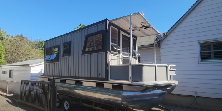 Это небольшое видео с прогулкой по моей самодельной понтонной лодке С сегоднешнего дня ты можешь видеть, что у нас есть виниловый сайдинг на окна. Мы только что сделали солнечный навес наверху с четырьмя солнечными панелями, мощностью 100Вт. Мы сделали разрез и снова поставили переднее ограждение, покрасили участки пола в светло-серый свет, чтобы соответствовать сайдингу. У нас есть 3-й понтон под лодкой. Сейчас он просто висит на ремнях. Следующий шаг — установить на него несколько трехдюймовых опускных кронштейнов. Чтобы опустить его так, чтобы он был на том же уровне, что и два других пантона. Это пантоны диаметром 25 дюймов и длиной 24 фута. Мы сделали окна нашего фургона из грубой сосны вокруг них, которые мы покрасили в черный цвет. Еще вентиляционное отверстие холодильника. Мы сделали то же самое с грубой сосной, а затем покрасили вертикальный виниловый сайдинг. У этой лодки 90-сильный двигатель Evan Rude с впрыском топлива и масла, который мы уже запустили, и он работает хорошо