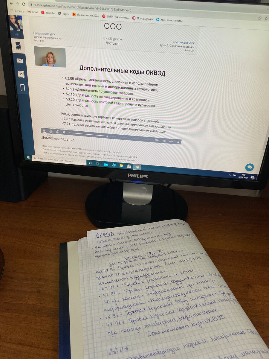 Первый день курса, открываю первый урок и понимаю что у меня паника, я ничего не понимаю и вообще хочу закрыть все и больше не открывать. Это не мое и я с этим не справлюсь. Но я переборола свой страх и решила первый урок пройти до конца. Первый видео урок состоял из записи где-то в час. Когда я его открыла я поняла что мои курсы будут состоять не из онлайн курсов, а с подготовленной заранее информации (видео, записи). Для меня это был большой страх, что я не могу никому задать вопрос во время урока, не смогу самостоятельно разобрать урок. Пройдя первый видео урок я поняла что ничего там сложного нет. На этом мой первый урок был закончен. Другую информацию я ещё не была готова «переварить». Следующие уроки были попроще для меня, чтобы мне было их лучше усваивать я стала записывать. На сегодняшний день я должна открыть ИП…