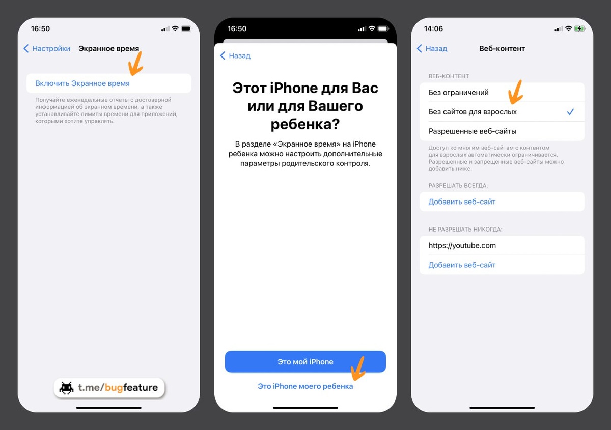 Рано или поздно родители покупают своему ребенку собственный смартфон. Чтобы как-то оградить свое чадо от нежелательного контента, нужно настроить ряд ограничений на самом гаджете. Для этого в iOS и Android предусмотрены целые разделы параметров. Сейчас расскажем, как быстро оградить ребенка от взрослых сайтов и опасных приложений. В последних версиях iOS контроль разрешений для ребёнка базируется на функции «Экранное время». Она даёт возможность создать правила для использования iPhone: определить часы покоя, задать ограничения для приложений и веб-сайтов. Чтобы настроить разрешения: 1. Откройте «Настройки», перейдите в раздел «Экранное время» и нажмите на кнопку «Включить Экранное время». 2. Тапните «Дальше», затем «Это iPhone моего ребенка». 3. Определите время покоя (для использования устройства в этот период времени потребуется ваше разрешение) и задайте лимиты на использование приложений, если это необходимо. 4. Задайте пароль на доступ к «Экранному времени», затем введите дан