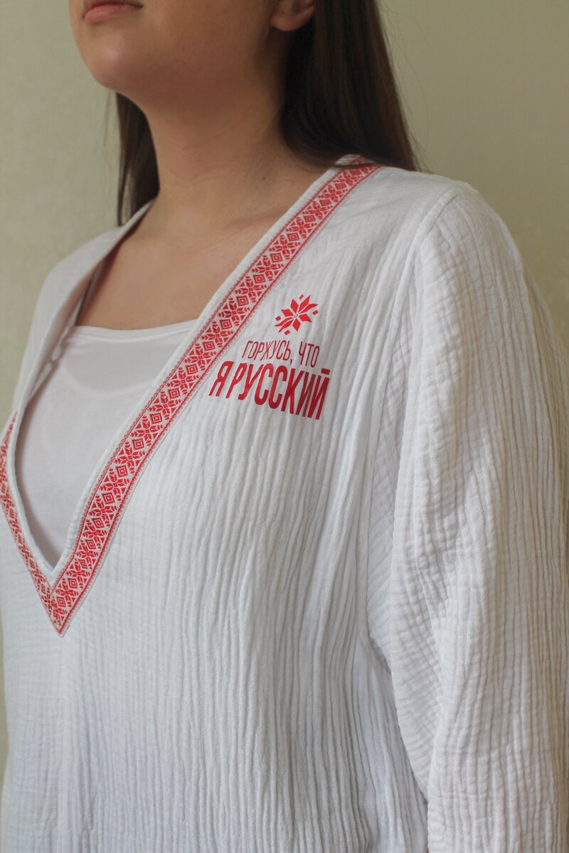 Именно эти фразы вдохновили нас на создание изделия и целой коллекции Поэтому право открыть показ предоставляем женской тунике с оберегом Алатырь и фирменной надписью! В это изделие заложено очень много смыслов: любовь, уважение, гордость, сила духа, единство, защита Туника сшита из натуральной ткани (хлопка). В тёплую и жаркую погоду будет особенно комфортно, потому что тело дышит, не создаётся парникового эффекта. Она очень практична и удобна. Важным плюсом являются большие карманы. Идеально сочетается с джинсами, лосинами и льняными брюками. Есть два варианта надписи: «Горжусь, что я русский» и «Мне не стыдно, что я русский». Можно выбрать ту, которая больше всего отзывается Изготовим по индивидуальным меркам и доставим в любую точку России, где есть пункты