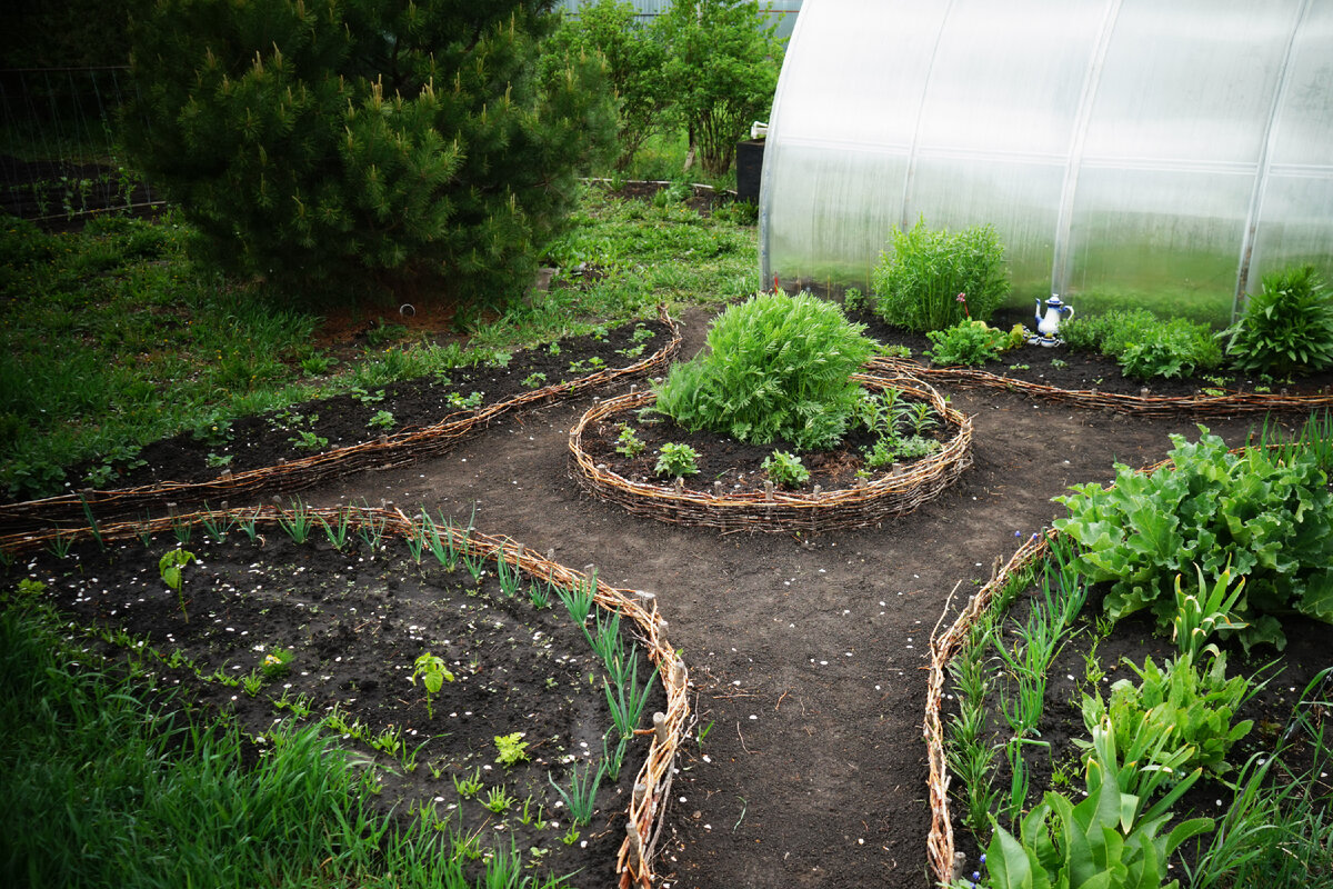 Я много лет мечтала создать в своём деревенском огороде уютный уголок для выращивания лекарственных и пряных трав. Такой небольшой аптекарский огородик. Два года назад моя мечта осуществилась. Идеи оформления такого уголка я находила в интернете. Мне нравилось, что на одной клумбе растут разные травы, и польза и красота. Еще хотела сделать не просто грядки, а что-то необычное, уютное, украшенное плетенкой. Весной два года назад я сначала сделала красивые грядки для моего аптекарского сада. Сами грядочки тоже сделала необычные, в центре большая круглая клумба, и по краям четыре грядки в виде полумесяца. Хотела, чтобы получилось всё аккуратно и необычно. Бордюр для грядок сплела из веток малины. О том, как я плела этот бордюр, подробно написала здесь (заходите по ссылке). Изначально в моём аптекарском уголке было мало трав. Что-то мне дали знакомые, что-то выкопала в лесу. Сейчас уже есть на что посмотреть. На одной грядке, которая ближе к теплице, высадила тархун, чабрец, шалфей, валер