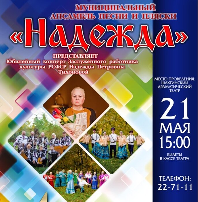 В предстоящую субботу в Шахтинском драматическом театре муниципальный ансамбль песни и пляски "Надежда" даст юбилейный концерт в честь заслуженного работника культуры РСФСР Надежды Петровны Тихоновой "Мечты сбываются". В концерте примут участие приглашённые гости из станиц Боковской и Вёшенской, из Новочеркасска, победители XVIII молодёжных Дельфийских игр России из Ростова-на-Дону, а также Центр современной хореографии "Империя танца". Читайте новости портала Шахты.SU в Телеграме: https://t.me/shahtysu Источник: https://www.Шахты.SU/2022/05/16/004/