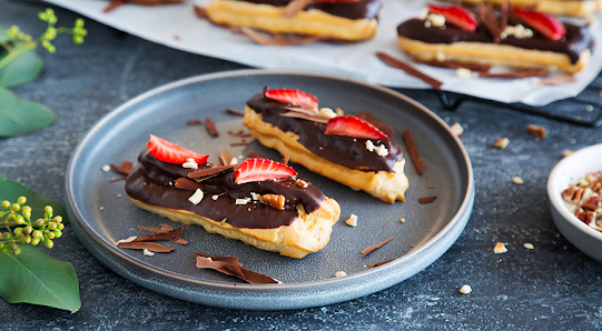 Классические эклеры Классические эклеры — не пирожные, а просто праздник какой-то! Но почему-то многие считают, что готовить их самостоятельно невероятно сложно. Это не совсем так, однако рецепт требует очень внимательного отношения к каждому пункту. Здесь действительно нет мелочей! Попробуете всыпать муку в горячую воду на плите — текстура теста будет неоднородной, да и вообще оно пригорит. Не дадите мучной массе остыть — яйца попросту заварятся, в результате чего пирожные не получатся. Есть и еще одна важная деталь. Если после добавления третьего яйца тесто уже стало достаточно пластичным, четвертое яйцо следует добавлять постепенно, буквально по чайной ложке. В общем, внимательно изучите наш рецепт, строго следуйте его указаниям, и тогда классические эклеры получатся безупречно, на радость вам и вашим близким! ИНГРЕДИЕНТЫ Для заварного крема: Для теста: ПОШАГОВЫЙ РЕЦЕПТ ПРИГОТОВЛЕНИЯ Шаг 1 Приготовьте тесто для классических эклеров. Муку просейте через мелкое сито. В небольшую кастр