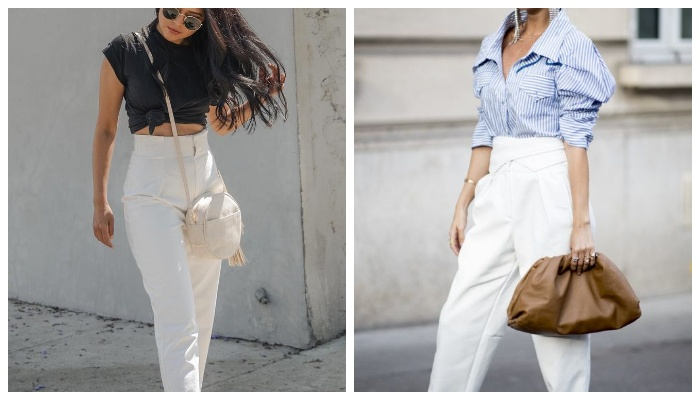 Если в вашем гардеробе есть стильные светлые брюки, но вы не знаете, как и с чем их сочетать, мы рекомендуем вдохновиться данной публикацией. Шикарный аутфит в притягательном монохроме сочетает в себе стильные широкие брюки, блузу, удлиненный жакет. Акцентными деталями являются мюли с широкой перемычкой, а также солнцезащитные очки со звериным принтом. Белоснежные широкие брюки с завышенной талией можно комбинировать с черной майкой, эффектными босоножками на высокой танкетке, а также контрастным клатчем. Монохром всегда выглядит эффектно, современно и целостно, убедиться в этом можно ознакомившись со следующим аутфитом, который включает в себя футболку, брюки палаццо и остроносые туфли белоснежного цвета. Черно-белая сумка шоппер шикарно вписалась в этот аутфит. Перед вами еще один шикарный летний look состоящий из полосатой блузки, брюк палаццо белого цвета, сабо, а также бежевого клатча в минималистичном исполнении. Образ с романтическим настроением состоит из светлых ультрамодных б