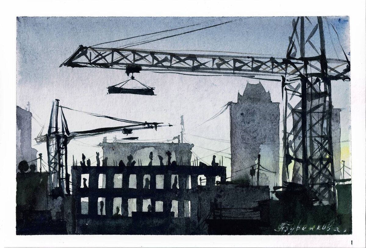 🌚Кризис человека, оказавшегося в ситуации цивилизационного изменения. . Недавно я ехала по ТТК. И увидела как даже вечером, строится дом. Строители были небольшими силуэтными фигурами, на фоне закатного неба. А сверху работал строительный кран, он подавал плиты на стройку. Я подумала, что мне нравится такое упорное созидание. И нарисовала эту картину, когда приехала домой. . -Сильно меняется окружающий мир, а будущее можно описать как неясное или неизвестное. -Человек меняет свои способы взаимодействия с миром. -Исчезают многие привычные способы справляться со сложностями. Психологические опоры некоторых людей разрушаются полностью. -Для некоторых людей становится крайне сложно найти новые опоры и смысли в жизни, так как разрушется и меняется как внешний мир, так и многие внутренние установки. -Высок риск развития различных психологических реакций на такие масштабные изменения. . -Важно найти поддержку. -Поддерживать себя. -Оставаться человеком. -Замечать свои чувства и мысли. -Дел