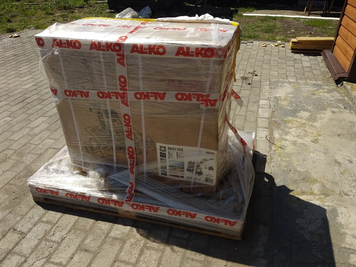 Изначально, когда ждали звонка из транспортной компании, договорились со знакомыми, чтобы приехали и помогли разгрузить. Все-таки вес самого устройства под 100 кг, плюс еще упаковка. Когда выгружали из машины, сразу стало понятно, что вещь основательная. Первые эмоции вызвала упаковка. Коробка стояла на паллете (а паллеты мы любим — это дрова как никак), и внутри обрешётка из металла. Который, кстати, позже пойдет на конструктивные элементы для телеги к этой технике.
