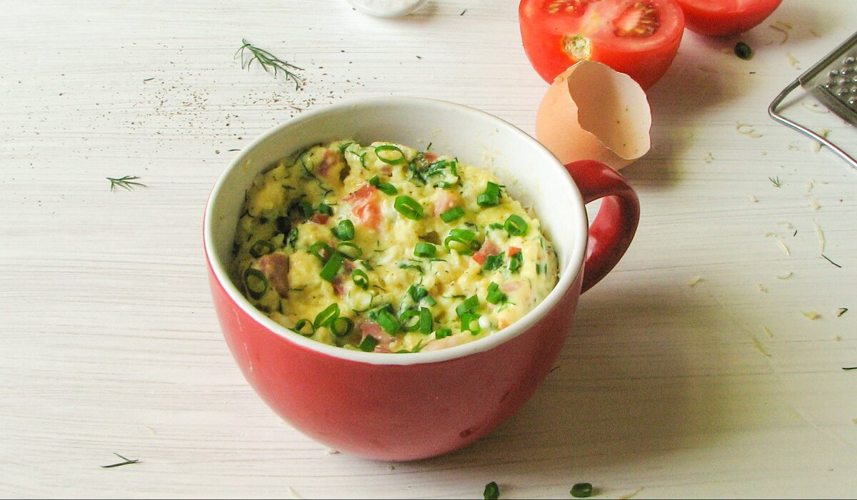 Ингредиенты Яйца - 3 штуки Молоко - 45 мл Соль - 1 щепотка Измельчённая ветчина - 3 ст. ложки Тёртый сыр - 3 ст. ложки Помидор - 1/2 штуки Зелень - по вкусу Приготовление 1․Взбейте яйца с молоком и щепоткой соли. 2․Добавьте ветчину, сыр, томаты и зелень, перемешайте. Разлейте яйца по двум кружкам, заполняя их на треть. 3․Готовьте омлет в микроволновке на максимальной мощности 1 минуту 40 секунд. Перемешайте массу пару раз в середине приготовления. ❤️приятного аппетита #Еда #Рецепты #омлет