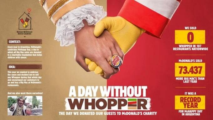Коллаборации брендов - это эффективный и пока ещё не тривиальный способ привлечь внимание новой аудитории к своему бренду. В последние годы коллаборации стали популярны и привычны: например, вы приходите в ресторан «Кофемания» и заказываете десерт «Павлова by Ingos», созданный в коллаборации с «Ингосстрахом», или покупаете транспортную карту «Тройку» с принтом футбольного клуба «Спартак». Такое партнёрство выгодно для обеих сторон: оно повышает охваты в медиа и соцсетях, количество продаж, новых клиентов и общую вовлечённость. Однако некоторые коллаборации способны приносить пользу не только их инициаторам. Речь о так называемых «добрых» коллаборациях - таких, к которым, на мой взгляд, должны стремиться бренды. McDonald's x Burger King (2017) McDonald's запустил в Аргентине благотворительную акцию - все средства, полученные от продажи бигмак, компания жертвовала на борьбу с онкологией. В тот же день Burger King объявил «День без Whopper» и убрал этот бургер из меню, чтобы поощрить пр