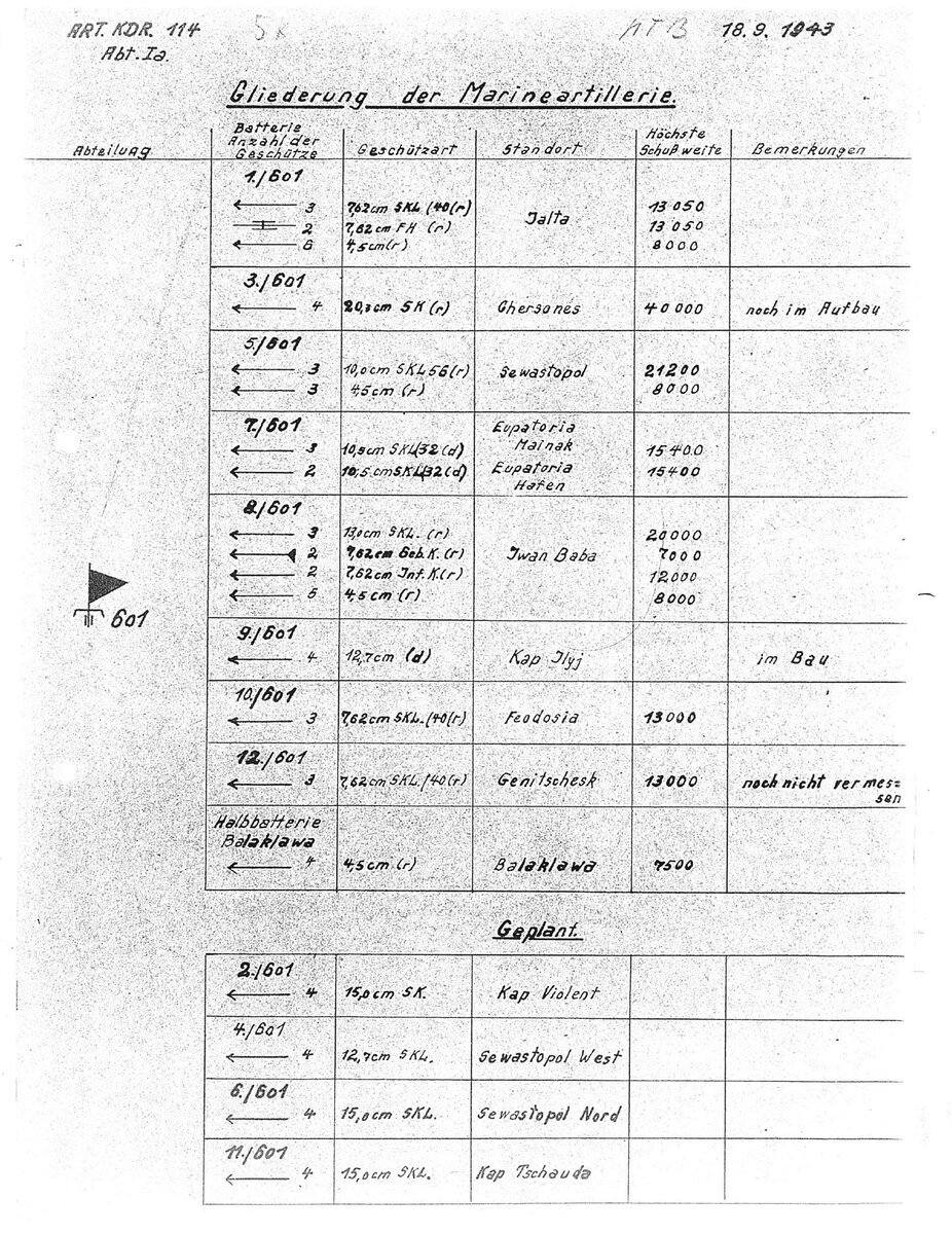 -8./601 (Иван Баба) В ее составе три бывших наших Б-13 (130-мм), две наших 76-мм горных пушки, две 76-мм двизионки (тоже трофейных), 4 пушки 21К бывшей советской батареи 736 в Судаке и две 45-мм противотанковых пушки.