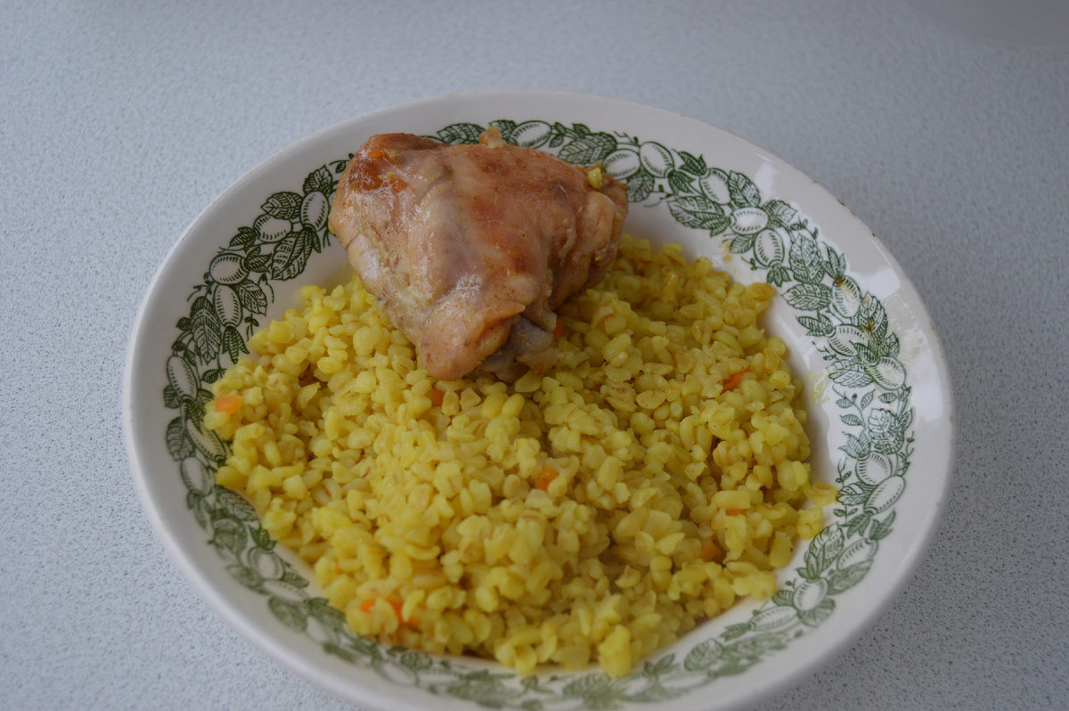 Приветствую всех любителей вкусной еды! Сегодня хочу поделиться с вами очень вкусного булгура с куриными бёдрами. Булгур — крупа из обработанной кипятком, высушенной и раздробленной пшеницы. Широко используется на Ближнем Востоке, Кавказе, Юге России, Балканах, севере Индии и в Пакистане, где он называется далия. Известен с библейских времен. Для приготовления нам потребуются следующие ингредиенты: Первым делом берём куриные бёдрышки, промываем, очищаем от кожи. Нарезаем лук с морковкой и обжариваем на сливочном масле. Наливаем подсолнечное масло для жарки наших бёдрышек. Ложим бёдрышки в сковородку и начинаем жарить. Вот такие красивые бёдрышки у нас получаются. Тем временем промываем булгур. Многие не промывают его, но посмотрите какая вода мутная. Мыть или нет - это на ваше усмотрение. В морковку с луком добавляем наш промытый булгур и обжариваем на среднем огне в течении 3-5 минут. После обжарки добавляем горячую воду из расчёта 1 часть булгура 2 части воды. Сковородку накрываем кр