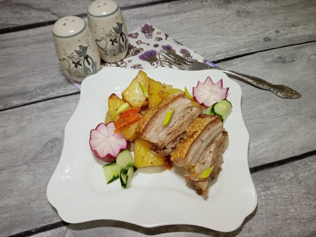 #непп Хочу предложить очень вкусный и достаточно простой способ запечь свинину в духовке. Я предпочитаю запекать пашину (брюшину), потому что мясо имеет прослоечку сала, что придает сочности. Мясо, запеченное таким образом, может быть как закуской, из которой можно делать бутерброды, так и основным блюдом в горячем виде! Ингредиенты: свиная пашина, картофель, морковь, чеснок, репчатый лук, соль, ч/м перец, растительное масло Способ приготовления: Пашину тщательно моем, а затем вытираем чистой тканью, убираем лишнюю воду. При помощи острого ножа, делаем глубокие надрезы, в которые вкладываем кусочки чеснока. Мясо солим, перчим. Втираем соль и перец в мясо. Картофель, морковь и лук чистим, моем. Картофель нарезаем крупными кусками. Лук полукольцами. Морковь нарезаем средними брусками. В миске смешиваем лук, картофель и морковь. Добавляем растительное масло, соль и ч/м перец. Перемешиваем. В рукав для запекания выкладываем мясо и картофель с овощами. Ставим его в холодильник на 2-3 часа.