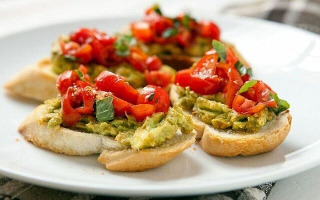Брускетта- сложный многослойный бутерброд на подсушенном или поджаренном хлебе. Изначально появился в Испании, сейчас распространён повсеместно и очень любим многими. Я тоже их люблю. Чем же так хороши брускеты? Во-первых - очень вкусны, во-вторых - с легкостью могут заменить основной приём пищи, наравне с гамбургерами и шаурмой, которые признаю только домашнего приготовления. Из огромного многообразия рецептов сегодня выделю один - вегетарианский овощной. Не смотря на отсутствие в нем мяса-колбасы, это очень вкусно! Для овощной брускеты понадобится красный болгарский перец, авокадо, чеснок, немного лимонного сока. 2. Болгарский перец запечь целиком, выложить на некоторое время в полиэтиленовый пакет. Очистить от кожуры и семян, порезать крупными полосками. 3. Авокадо очистить, мякоть размять вилкой и соединить с тёртым зубком чеснока. Полить лимонным соком. 4. Намазать авокадо на хлеб, сверху выложить болгарский перец с небольшим количеством соли и зелени. Красота!
