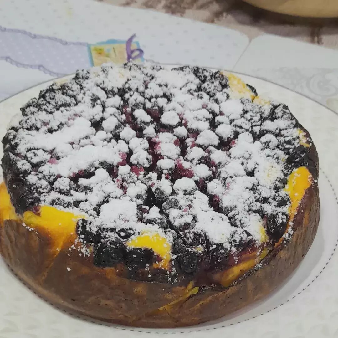 Это мой самый любимый рецепт запеканки. Она больше похожа на пирог) Ингредиенты: творога 5% (360 гр), яйца, манки, сахара, ванильного сахара, соли, Любые по- вашему вкусу ягоды, свежие или замороженные, сахарной пудры Способ приготовления: В миску помещаем творог, желтки яиц, сахар, ванильный сахар, соль, манку. Пробиваем погружным блендером до однородности. Взбить белки до стойких пиков и ввести в творожную массу, перемешивая лопаткой. Форму (у меня диаметром 16 см) застилаем пекарской бумагой, предварительно хорошо её смять. Вылить в форму творожную массу. Сверху выложить ягоды. У меня мерзлая смородина. Можно любые. Ставим в заранее разогретую духовку до 180 ° на 45-50 минут. Достать из духовки, немного остудить, вынуть из формы, посыпать сахарной пудрой, переложить на блюдо, можно нарезать и угощаться.
