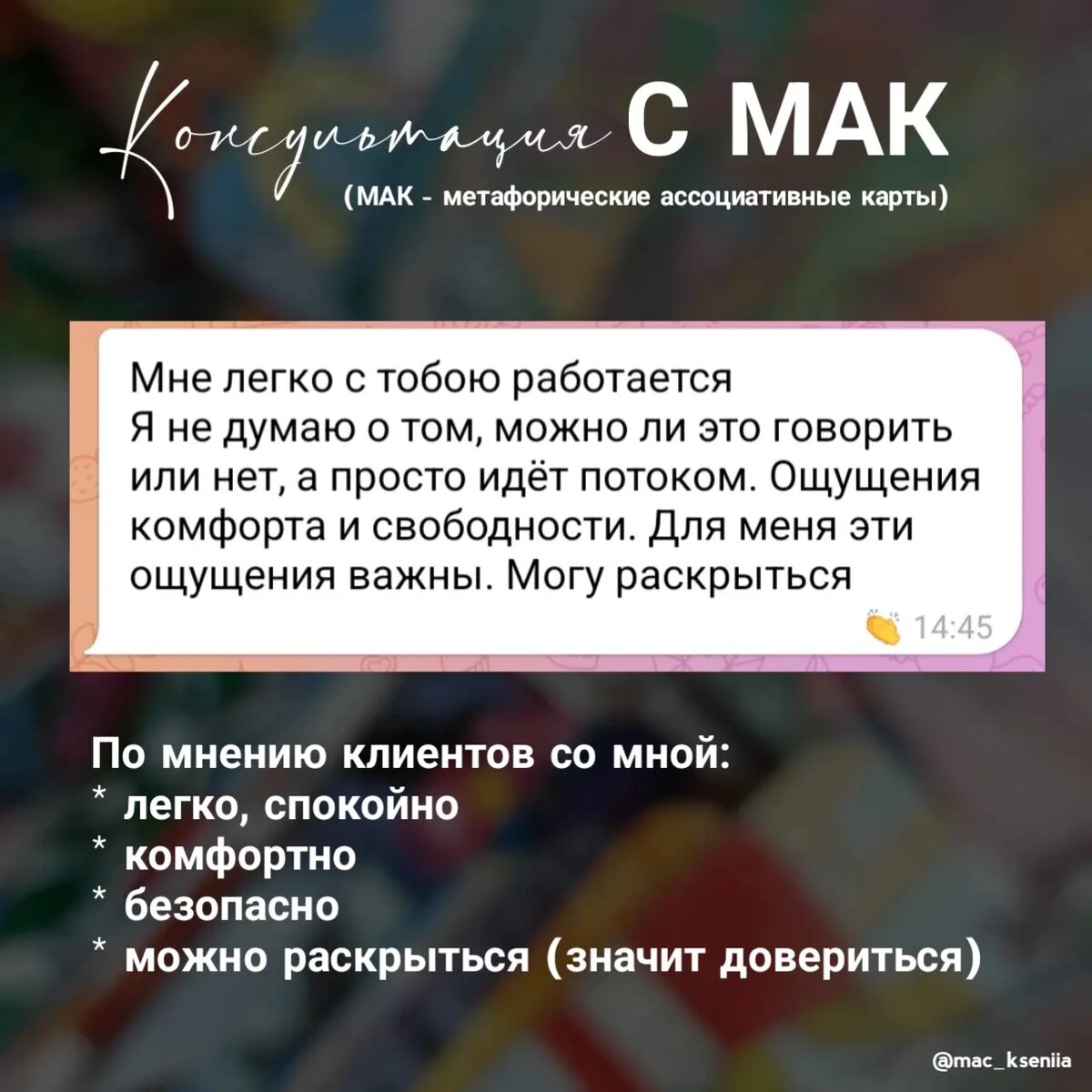К тому же, по мнению клиентов на моих консультациях безопасно, спокойно, комфортно и мне можно легко доверить свою тревогу, вопрос, чтобы я помогла это разрешить (в раскладке есть отзыв клиента)