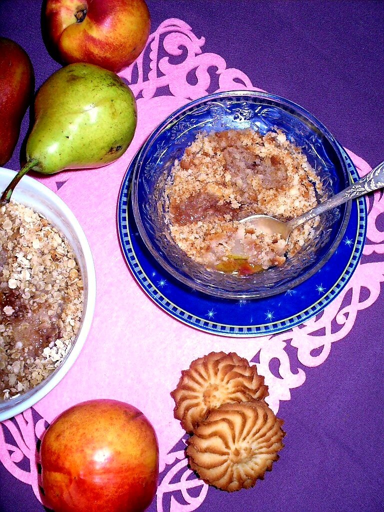 Рецепт для занятых людей, которым некогда стоять у плиты. Приготовления этого десерта займет 10 минут. груша - 1 штука, нектарин - 1 штука, печенье песочное - 6 штук, хлопья овсяные, быстрого приготовления (мелкий помол) - 1,5 столовые ложки, миндаль молотый - 1 столовая ложка, масло сливочное - опционально, сахар "демерара" - по вкусу. Грушу и нектарин нарезать небольшим кубиком. Выложить в удобную посуду, слегка присыпать коричневым сахаром, по вкусу. Печенье, хлопья овсяные и молотый миндаль растолочь в крошку (можно использовать скалку). Полученную массу высыпать равномерным слоем на фрукты. Сверху выложить тонкие ломтики сливочного масла. Запечь в микроволновке в течении 3 - 5 минут. Для дождливого вечера - самое оно) #десерт без духовки #десерт без выпечки #крембл #десерт к чаю #простой рецепт #кулинарные советы