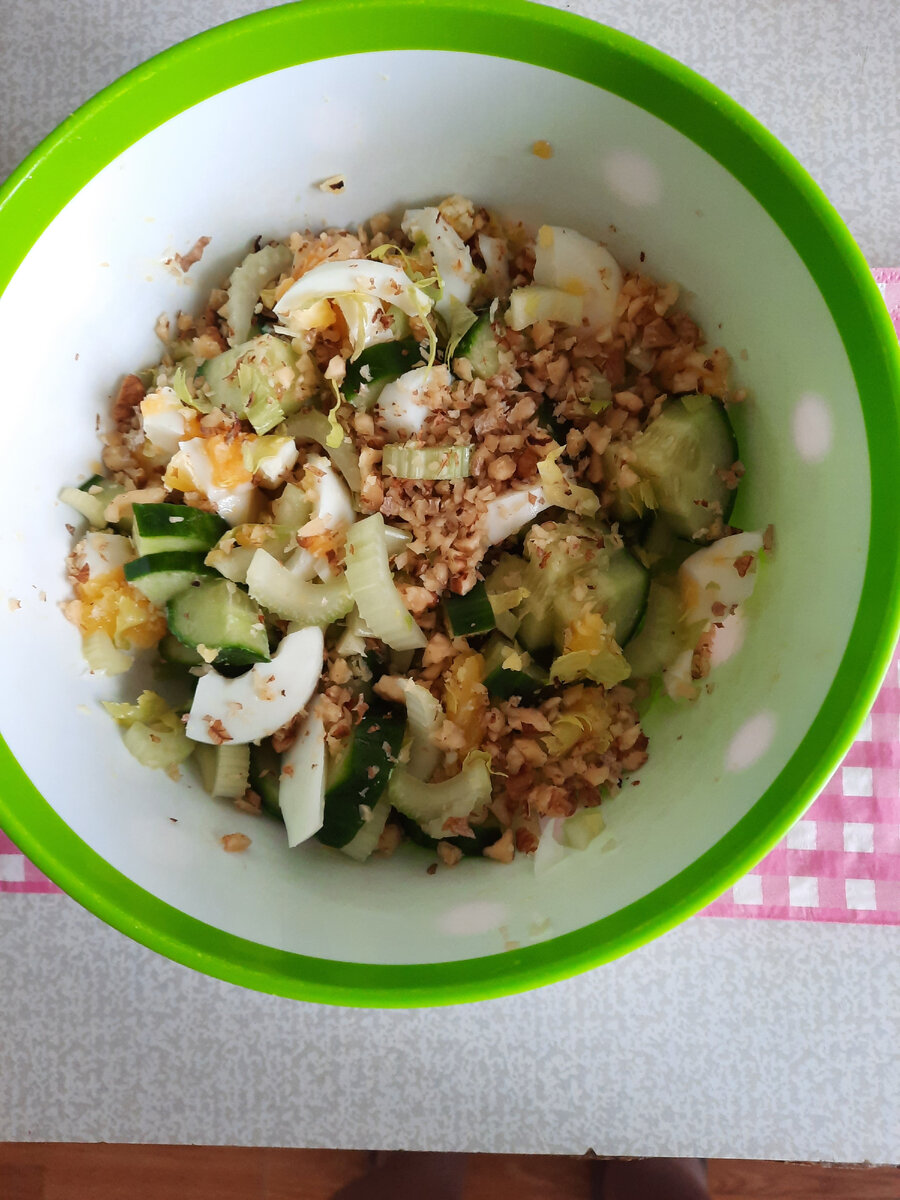 В составе этого салата зелёный черешковый сельдерей, продукт с очень своеобразным вкусом, кому-то может и не понравиться. Я вам больше скажу, мне он тоже не очень понравился первый раз. Но в моём характере есть такое - если продукт полезный, может быть и не очень вкусный, я всё равно буду его употреблять, хотя бы изредка. Так было и сельдереем. И что вы думаете? Через какое-то время, я заметила, что ем сельдерей уже с удовольствием и с большим желанием. Немного о полезных, я бы сказала, об уникальных свойствах сельдерея. Он избавляет от бессонницы, улучшает сон. Снижает уровень сахара. Улучшает память и внимание. Активно выводит лишнюю жидкость, положительно влияет на работу мочевыводящих путей. Немного снижает артериальное давление. Уменьшает риск развития онкологических новообразований!Оказывает благоприятное воздействие на нервы, помогая восстанавливаться после стресса и переутомления из-за работы. Впечатляет, да? Теперь вернемся, собственно, к салату. На две-три порции подготовьте