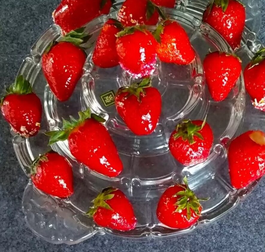 🍓клубника 🍓 Сладкоежки оценят 🤩 Понадобится: ✅300-400 г. Клубника ✅275 г сахар ✅300мл воды ✅2-3 ч. л.красный пищевой краситель ( по желанию) ✅1 чайная ложка -уксусная эссенция или лимонный сок Что с ней делаем: Вымойте клубнику и дайте ей стечь.Оставьте зелень, внешнюю чашечку, листья. Они также полезны (Витамин C) , их можно тоже кушать 😍 Посыпьте большую тарелку сахаром или разноцветной сахарной посыпкой, мы позже положим сушиться наши засахаренные ягоды Клубнички. Берём кастрюлю, Насыпаем сахар, наливаем воду, уксус или лимонный сок и красный пищевой краситель по вкусу, доводим до кипения на сильном огне, помешивая, затем уменьшаем огонь наполовину, варить около 20-30 минут, пока не образуется сиропообразная консистенция. терпение, ❤️ нужно время! Затем снимите кастрюлю с огня и с помощью зубочистки окуните клубнику в глазурь, переверните и сразу же положите на сахар или посыпку для застывания. Затем съешьте его, в противном случае охладите! Клубничка получается Прево