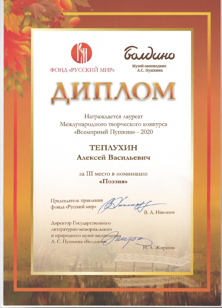 Одной из самых интересных своих наград Алексей Теплухин отмечает диплом за участие в проекте "Болдинская осень" в рамках Международного творческого конкурса "Всемирный Пушкин". Поэт вспоминает: "Мне предложили приехать и проживать за счет организаторов на время проведения конкурса в Болдино. Обещала быть насыщенная программа. Однако по ряду причин я не поехал, приняв участие в конкурсе заочно. Тексты мои уже были отобраны в финал, но я не знал, займу ли призовое место. На мое отсутствие сказались и самочувствие, и работа, и бытовые проблемы. Психологически я не был готов куда-либо ехать. Конечно, приятно было узнать, что я стал лауреатом Международного конкурса. Считаю это значимым событием в моей небольшой творческой биографии". Поддержать автора: