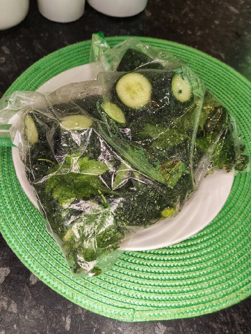 Просто и очень быстро, всего 4 часа👍 Ингредиенты: Огурцы, Чеснок, Соль , Сахар , Укроп, Листья смородины по желанию, Перец душистый горошек Способ приготовления: Огурцы промыть и обсушить, обрезать кончики. Чеснок измельчить, укроп порвать или нарезать крупно. Взять плотный пакет или пакет с ЗИП замком. Переложит огурцы в пакет. Добавить мелко измельчённый чеснок(у меня были свежие побеги чеснока), укроп, соль, сахар, перец душистый горошек и листья смородины. Закрыть пакет, чтобы там оставался воздух и все хорошо перемешать, затем воздух из пакета убрать по максимуму и оставить при комнатной температуре на 4 часа. Спустя это время огурцы готовы, хранить в холодильнике.