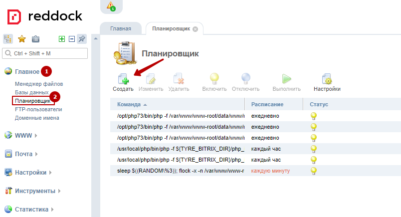 Cron (Command Run ON) — это планировщик задач на операционной системе Linux. Он запускает скрипты по расписанию. Это могут быть запуск создания резервной копии почтовых событий и др. Как это работает: в административном разделе сайта на 1С-Битрикс расположен скрипт, планировщик хостинга запускает его работу с определенной командой и частотой. Для создания задания на cron на панели управления хостингом перейдите в Главное (1) → Планировщик (2). Нажмите «Создать». Откроется вкладка с настройками нового задания. Введите: Далее укажите описание и расписание задания. На CMS 1С-Битрикс используют технологию Агентов для запуска функций. Это запись в базе данных, которая содержит информацию о запуске задания в определенное время. По умолчанию агенты запускаются по событиям. Их переводят на cron для работы по расписанию. Воспользуйтесь инструкцией Справочного центра для перевода агентов на cron.