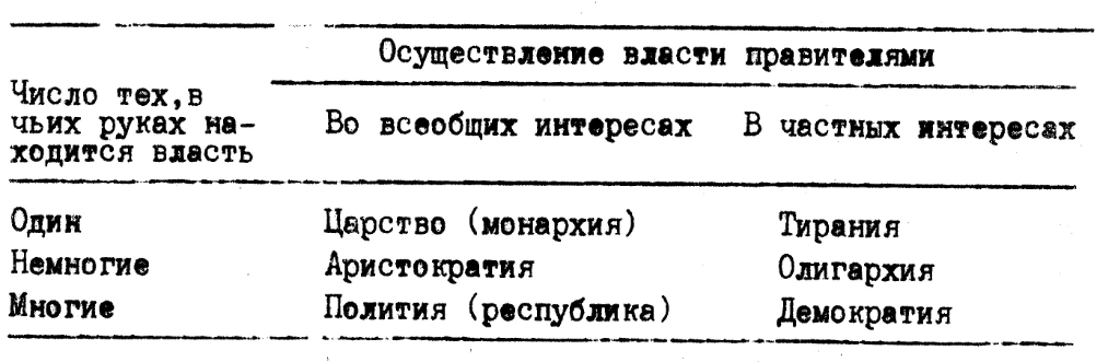 Чистые формы. В чистых формах, где власть осуществляется в интересах всех, классификация проводится по количеству правителей — монархия (от "монос" — один и «архе» - командование, правление), иначе называемая царством, где правление единоличное;