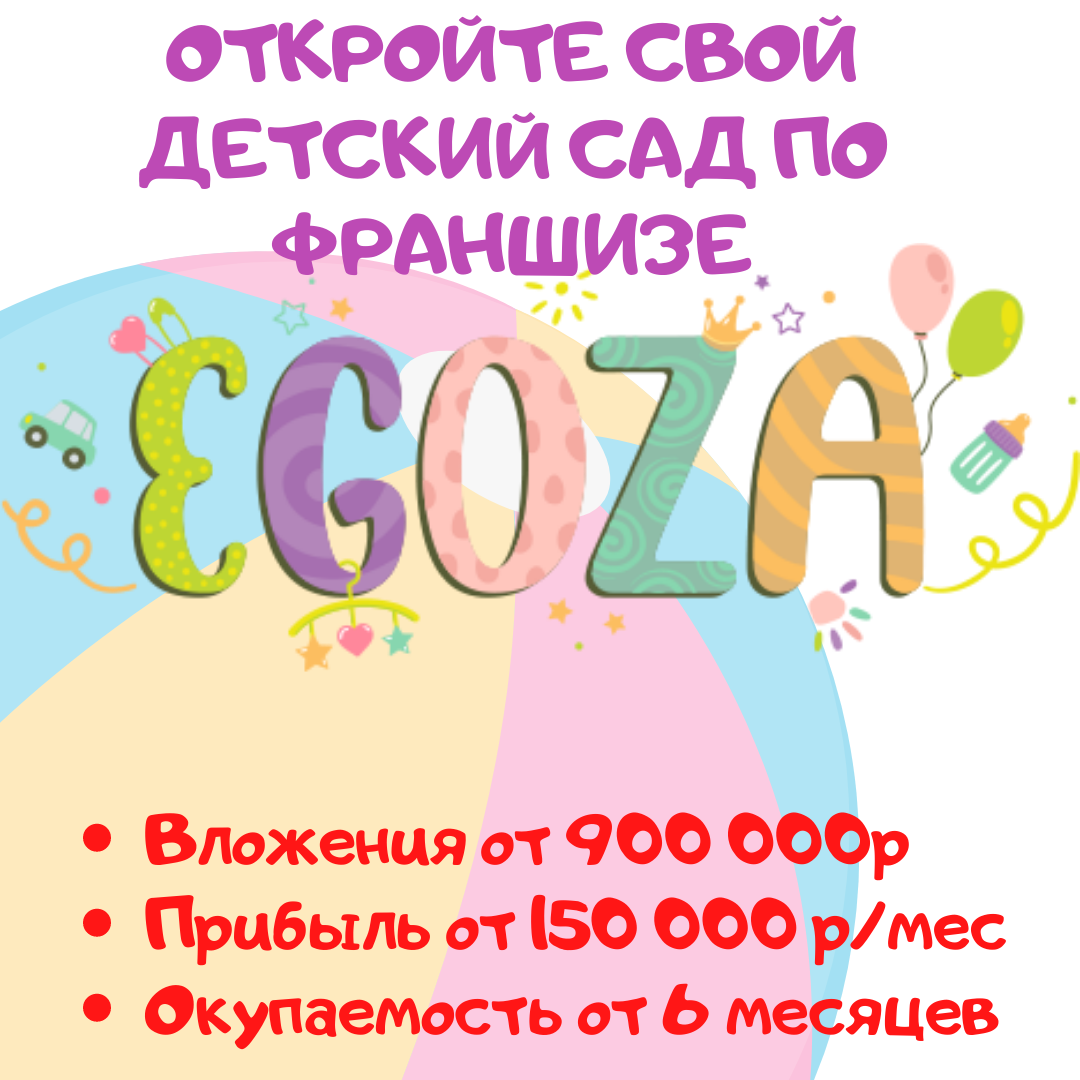 Небольшие вложения! Стабильная прибыль! Быстрая окупаемость! Сейчас самое время! Успейте открыть свой детский сад EGOZA до начала учебного года! Чтобы получить более подробную информацию, звоните по номеру 88002507444 и 89130020365 или оставляйте заявку на сайте https://www.egoza.club/franchise. Также можете написать Ваши вопросы здесь, с радостью на них Вам ответим.