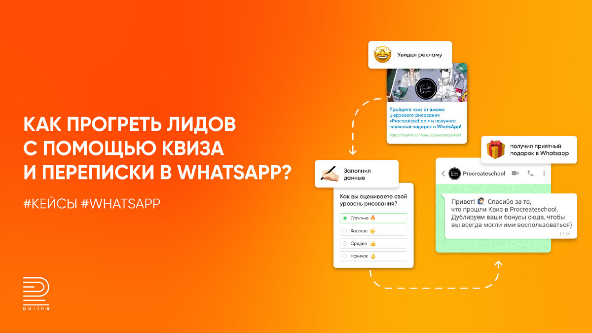 Кейс о том, как квизы и WhatsApp помогают экономить время менеджеров и увеличивать конверсию в оплату. «Привет! Вы узнаете, как мы помогли онлайн-курсу автоматизировать путь клиента от показа рекламы до оплаты», — Ленар Юсупов, Партнер Radist.Online. О клиенте Онлайн-школа по обучению рисованию на планшетах «Procreateschool». Одна из основных рекламных кампаний была направлена на то, чтобы лиды подписывались на квизы и заполняли формы на сайте. Путь клиента: увидел рекламу, перешел на квиз, заполнил все вопросы, получил приятный подарок. Задача 1. Пополнить клиентскую базу, сподвигнув клиентов оставить свой номер телефона 2. Автоматизировать отправку подарка клиенту в WhatsApp, чтобы менеджеры не занимались этим вручную 3. Увеличить продажи курсов в WhatsApp c помощью рассылок и воронок Решение Первым делом, подключили сервис квизов к amoCRM. Настроили таким образом, чтобы все сделки создавались на этапе "Первичный контакт", а затем автоматически переходили на следующий этап. Все, что