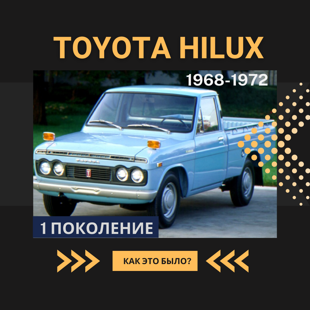 🚘 Среднеразмерный пикап от Тойоты, машина за счёт своей простоты (рамная конструкция, продольное расположение двигателя, подключаемый полный привод), функциональности и ремонтопригодности заслужила огромную популярность по всему миру. Многие компании, занимающиеся тюнингом автомобилей, создают из обычных пикапов настоящих покорителей бездорожья. В данный момент существует 8 поколений Hilux. В 2017 году международная группа автоэкспертов объявила Toyota Hilux лучшим подержанным пикапом года ⌛️Немного истории: Производство Hilux началось в марте 1968 года. Hilux RN10 выпускался версии с малой колёсной базой и с двигателем 1,5 литра. В феврале 1971 года двигатель заменили на 1,6 литра. В апреле 1969 года добавилась версия с увеличенной колёсной базой. Версия с малой колёсной базой осталась в производстве. Hilux стал очень успешной моделью, отличавшейся надежностью, простотой конструкции и отличной проходимостью. Hilux Pick Up был популярен не только в Японии, но и во многих странах по вс