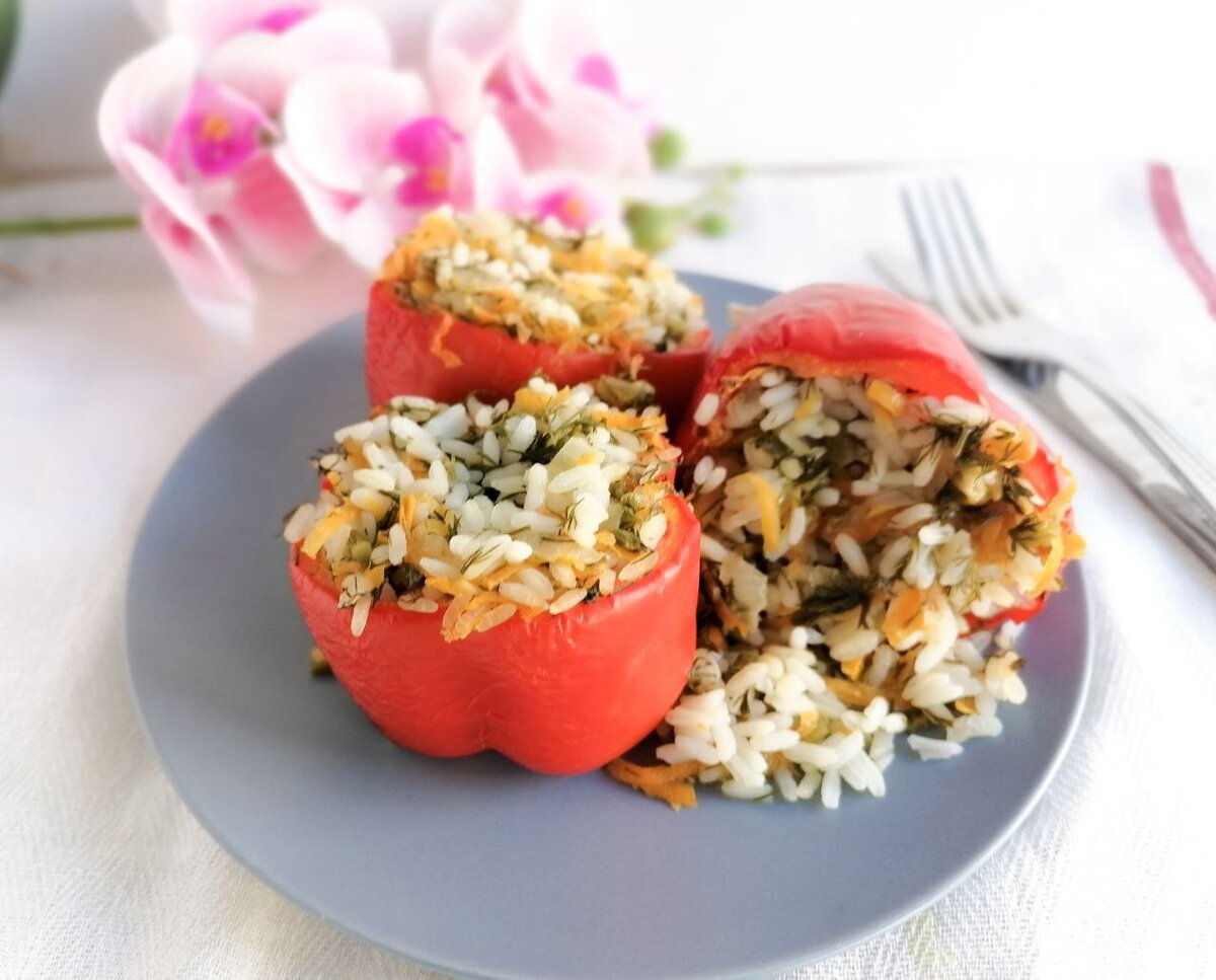 Смешать лук с морковью, рубленую зелень и рис в одной посуде. Посолить и поперчить по вкусу. Перцы вымыть, срезать верх и очистить от семян. Нафаршировать перец начинкой, сверху выложить "шляпки". Выложить в форму для запекания. Запекать в течение 30-40 минут в предварительно разогретой до 180 градусов духовке. Ингредиенты 1/2 стакана риса 4 шт. болгарского перца 1 луковица 1 морковь 1 ст. л. растительного масла пучок укропа по вкусу соль, перец #обед #перец #кулинария #рецепты