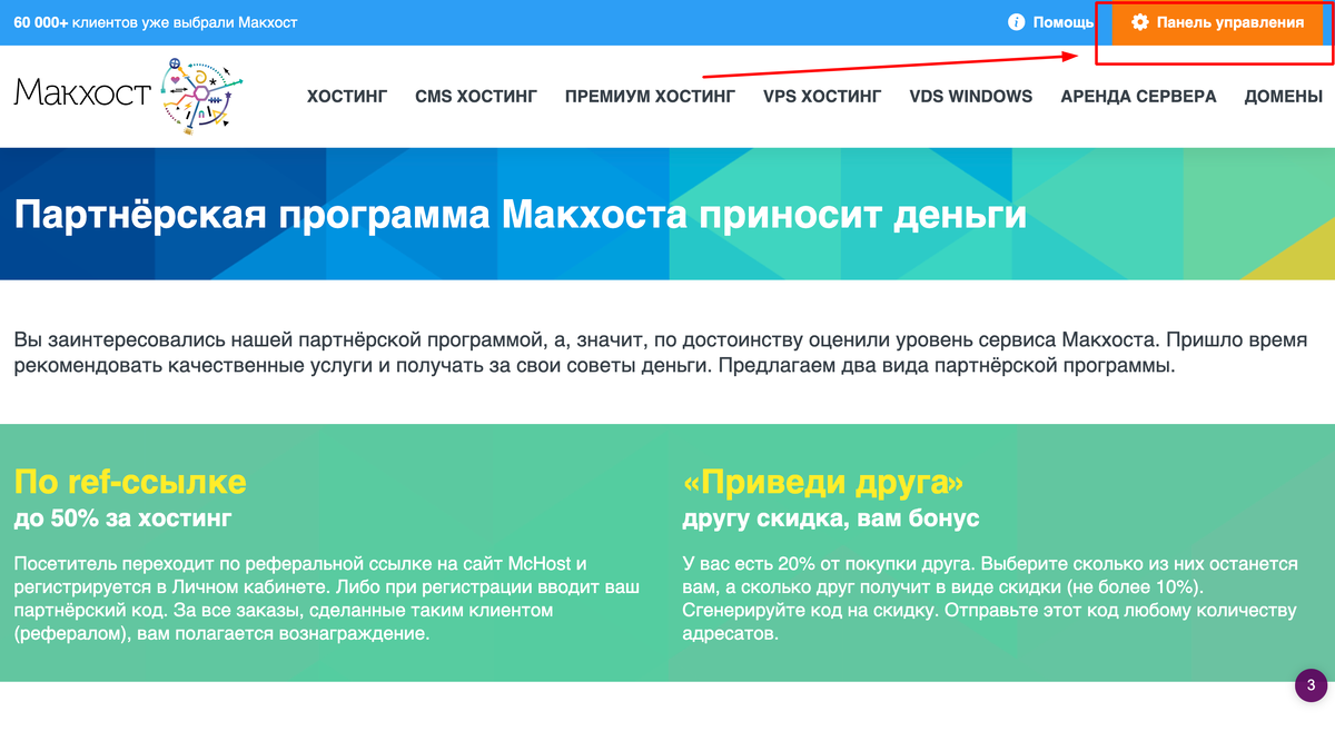 Партнерская программа или «партнерка» — это вид сотрудничества между компанией и клиентом, в результате которого клиент получает определенное вознаграждение или бонусы за новых привлеченных клиентов в эту компанию. Если рассматривать партнерские программы хостингов, то сотрудничество обычно происходит в следующем формате: 1) Участник партнерской программы заходит на сайт хостинг-провайдера и регистрируется в специальной панели управления. 2) Следующий шаг — получение реферальной ссылки. Узнать ее можно в личном кабинете. 3) Затем клиент распространяет реферальную ссылку любыми разрешенными способами (например, большинство провайдеров запрещают запускать брендовую рекламу с реферальными ссылками в поиске). 4) Чем больше пользователей зарегистрировались по реферальной ссылке и оплатили услуги, тем больше будет доход партнера. Обычно партнерские выплаты составляют от 10% с привлеченного клиента (подробности уточняйте напрямую у хостинг-провайдера). Как заработать на партнерской программе