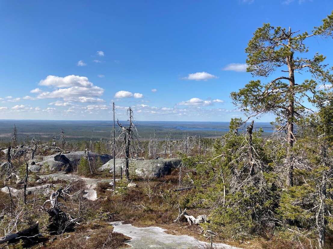 В сухую погоду он довольно нетрудный, местами, правда, уклон достигает 60 градусов, но тропа хороша набита, есть корневые ступени и каменные полки, на которые удобно опираться. Спустя 10 минут подъема мне уже открылся вид на окрестные леса и болота, а погода позволяла разглядеть самые отделанные горизонты.