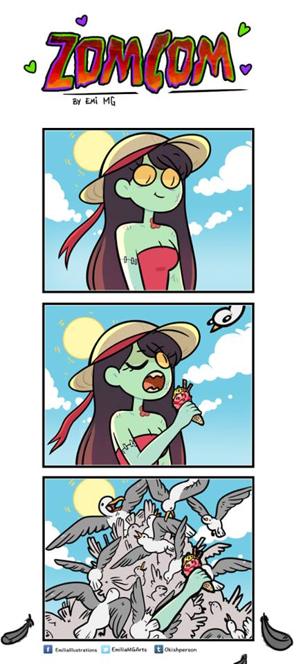 Тема зомби всегда казалась людям интригующей и загадочной. Все-таки очень интересно взглянуть на живых мертвецов. Про них есть очень много фильмов и игр, да и комиксов полным-полно. Есть и увлекательная серия комиксов, которая объединяет между собой зомби и комедию. Коллаборация получилась весьма неординарной. ЗомКом – серия очень милых сюжетов, которые рисует художница по имени Emi MG. Она рассказывает о влюбленной паре – девушке-зомби и парне-оборотне. Кроме того, комиксы рассматривают друзей героев – это всевозможные сверхъестественные существа, даже призраки и скелеты. Эмилия прекрасно разбирается в художественном искусстве, поскольку она получила специальное образование на эту тему. Она мастерски воплощает свои задумки и делится ими с поклонниками. Ее творчество удивительным образом сочетает тонкий и душераздирающий хоррор и смешные шутки. Персонажи, которые кажутся столь необычными, оказываются, тоже сталкиваются с рядовыми ситуациями, характерными для простых людей. Кстати, несм